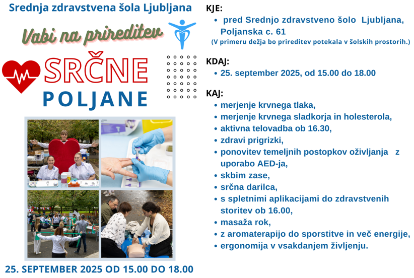 Četrtna skupnost Trnovo vabi na dogodek Srčne Poljane, ki bo v četrtek, 25. septembra 2025, med 15. in 18. uro v parku pred Srednjo zdravstveno šolo Ljubljana.