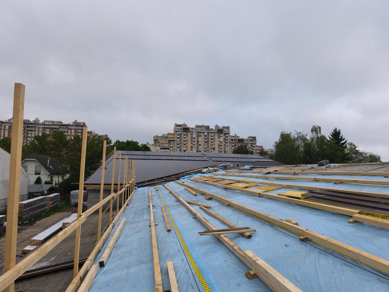 Oktober 2025 - Dela potekajo skladno s terminskim planom, betoniranje sten vezano na statično sanacijo je zaključeno. V pritličju in nadstropju se izvaja vgradnja stavbnega pohištva, grobi razvod elektrike in strojnih inštalacij, izvajajo se krovsko kleparska dela na celotni strehi objekta z izolacijo. Foto: Arhiv MOL | Avtor fotografije: arhiv MOL