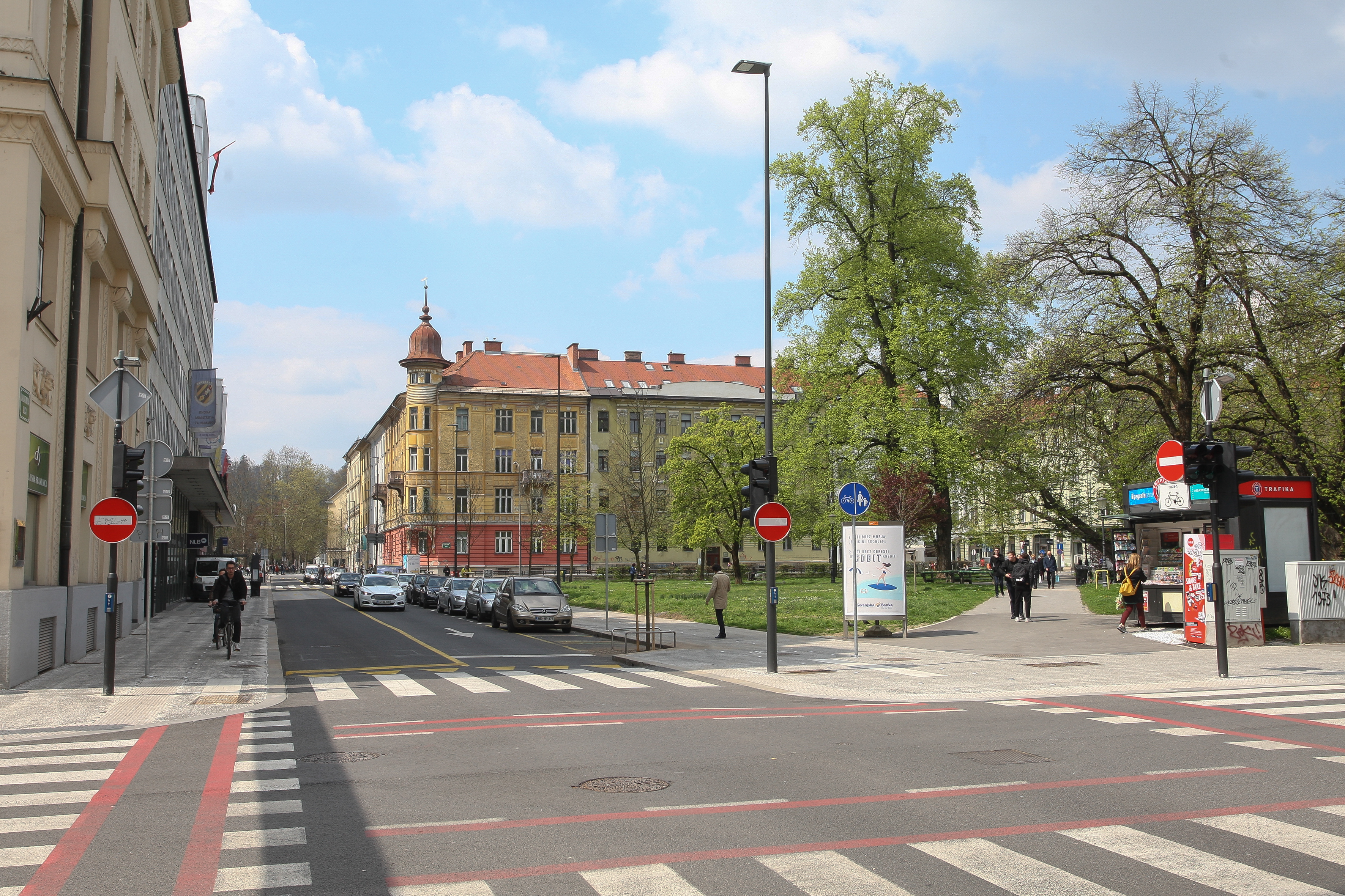 Na odseku med križiščem s Celovško cesto in Zupančičevo ulico smo ukinili en vozni pas v smeri proti središču mesta, v nasprotni smeri pa ni več ločenega desnega zavijalnega pasu na Tivolsko cesto. S tem smo dobili dodatne površine za pešce in kolesarje.
