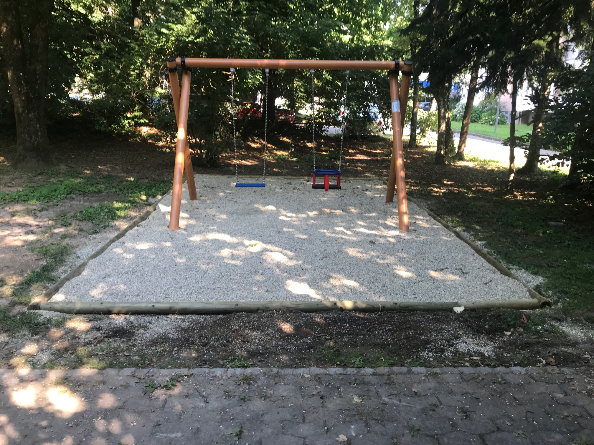 Peščeni igralni otoki, ki so obrobljeni z ladijsko vrvjo in vpeti v kovinske utore, so med drevesi razporejeni na eliptično potezo, določeno s tlakovano površino in posameznimi skalami in čoki. Med bolj klasično opremo, kot so peskovnik, prevesnica, tobogan ali vrtiljak, so novost predvsem glasbena igrala, dendrofon, telefonček, nihajne krogle in kalejdoskop.