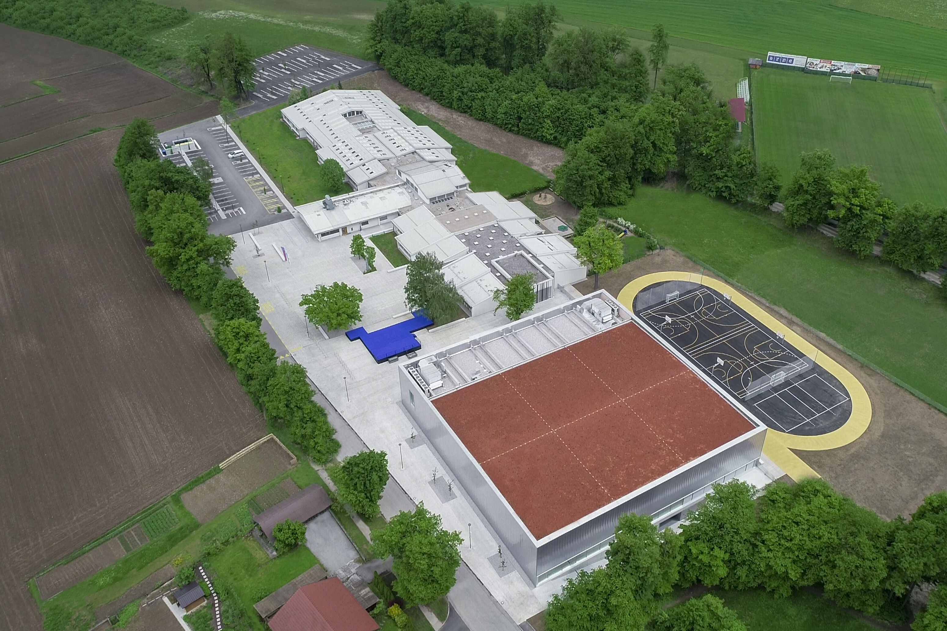 Nova telovadnica bo zadostila potrebam šole in širše lokalne skupnosti ter bo namenjena tudi za organizacijo tekmovanj in prireditev.Gradnja dvorane, ki so jo arhitekturno zasnovali v ateljeju Medprostor pod vodstvom arhitekta Roka Žnidaršiča, je trajala približno eno leto. Tudi ta projekt smo celovito trajnostno zasnovali, predvideli sistem prezračevanja z najvišjimi izkoristki in uporabo povratne toplote. Na meritvi zagotavljanja zrakotesnosti objekta smo dosegli najboljši rezultat pri sNES javnih novogradnjah (»skoraj nič energetske stavbe«).