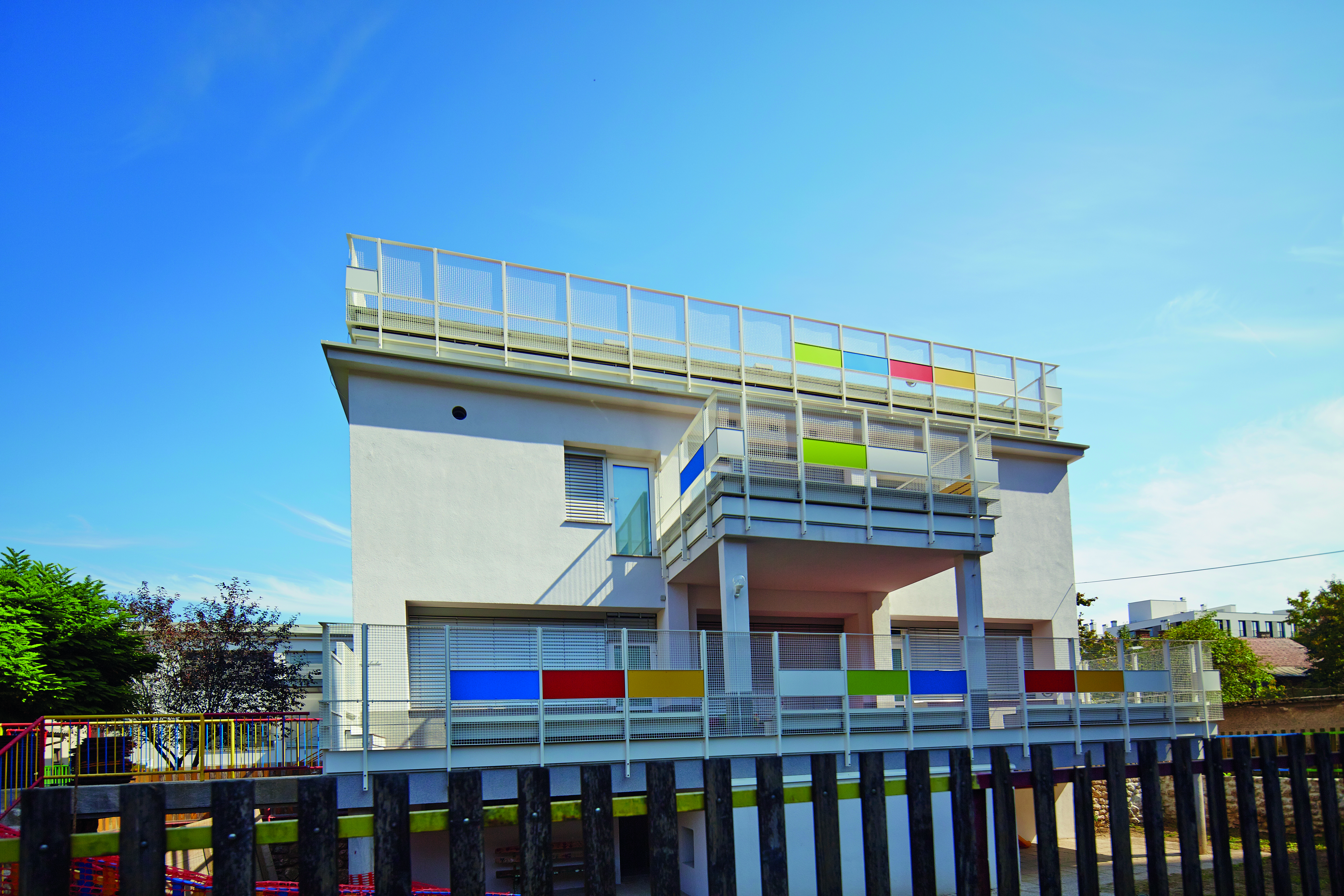 Namestili smo varovalne ograje in delno nadstrešnice. Uredili smo tudi zunanje površine ter namestili klopi in igrala. Zaradi novih parcelnih mej smo zamenjali tudi varnostne ograje.