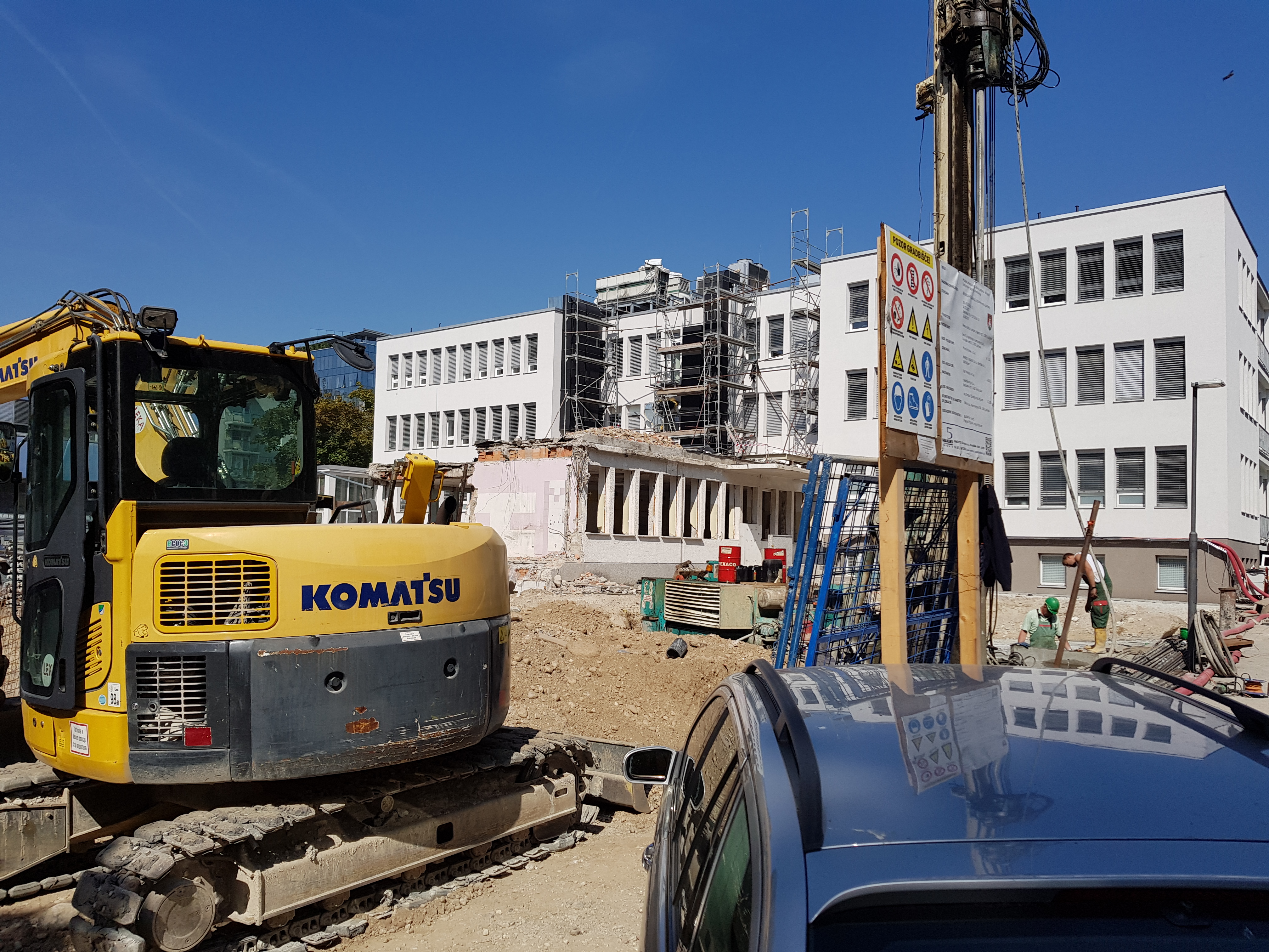 Gradnja objekta je bila zahtevna, saj je zajemala tudi injektiranje (podbetoniranje) pod temelji obstoječega objekta ter izdelavo zagatnih sten pri izkopu gradbene jame, kar je povzročalo veliko hrupa. Zahvala za veliko potrpežljivosti ob tem gre okoliškim stanovalcem in gimnaziji ter seveda vsem zaposlenim.